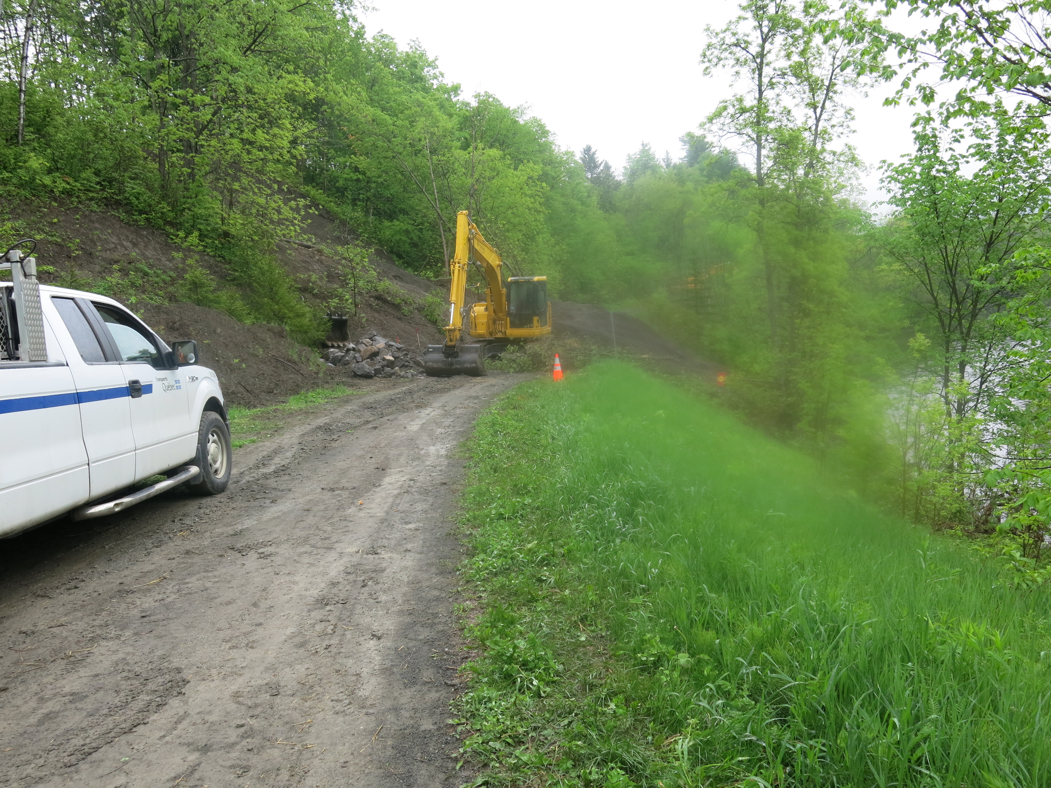 There are two mechanical diggers at the site of the landslide caused by heavy rain. An operator told me May 29 that it will take two weeks to put the trail back in travelling order. The Vélo-Québec web site says it will take some weeks. Keep up to date here:http://www.routeverte.com/rv/infotravaux (in French).
