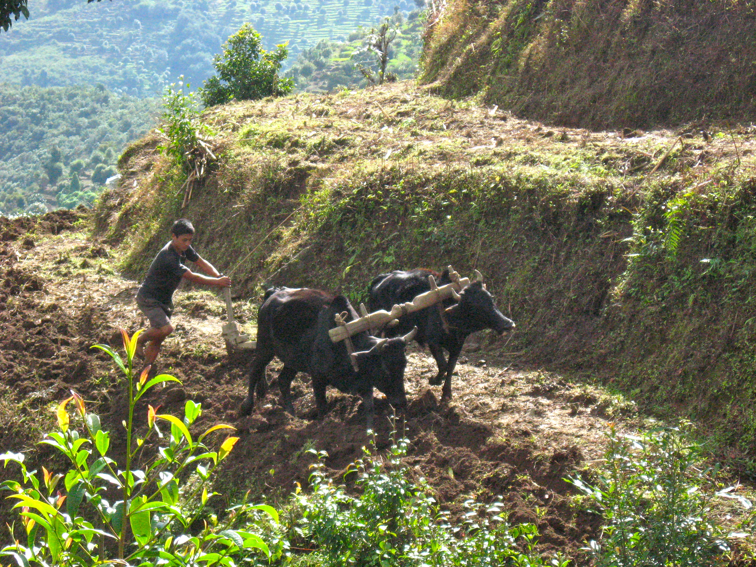 FARMER PLOWS TERRACED FIELD